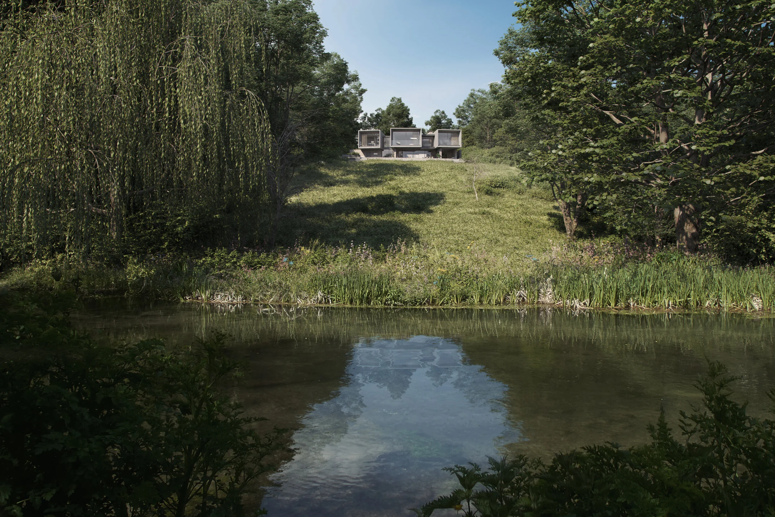 The site is hidden down a quiet residential lane with a strong visual connection to the surrounding verdant context. From the lane the site steps and slopes towards its east boundary to meet the Itchen Navigation, a SSSI and the South Downs National Park. The existing traditional three storey house sits at the highest part of the site, leaving it visually exposed when viewed from across the Itchen Valley.