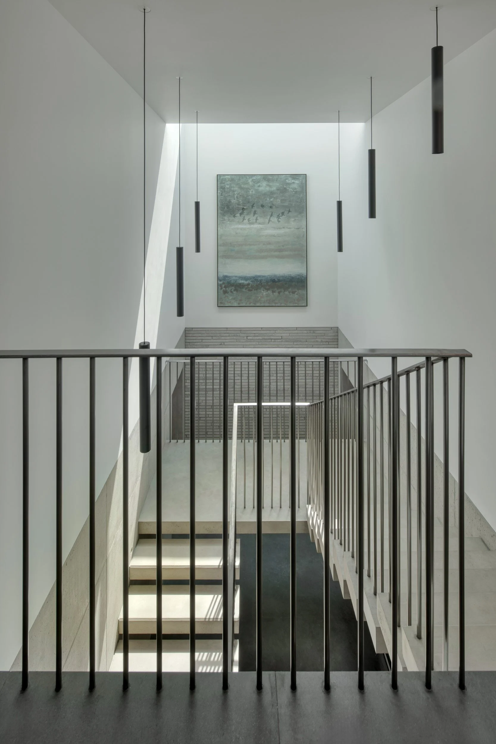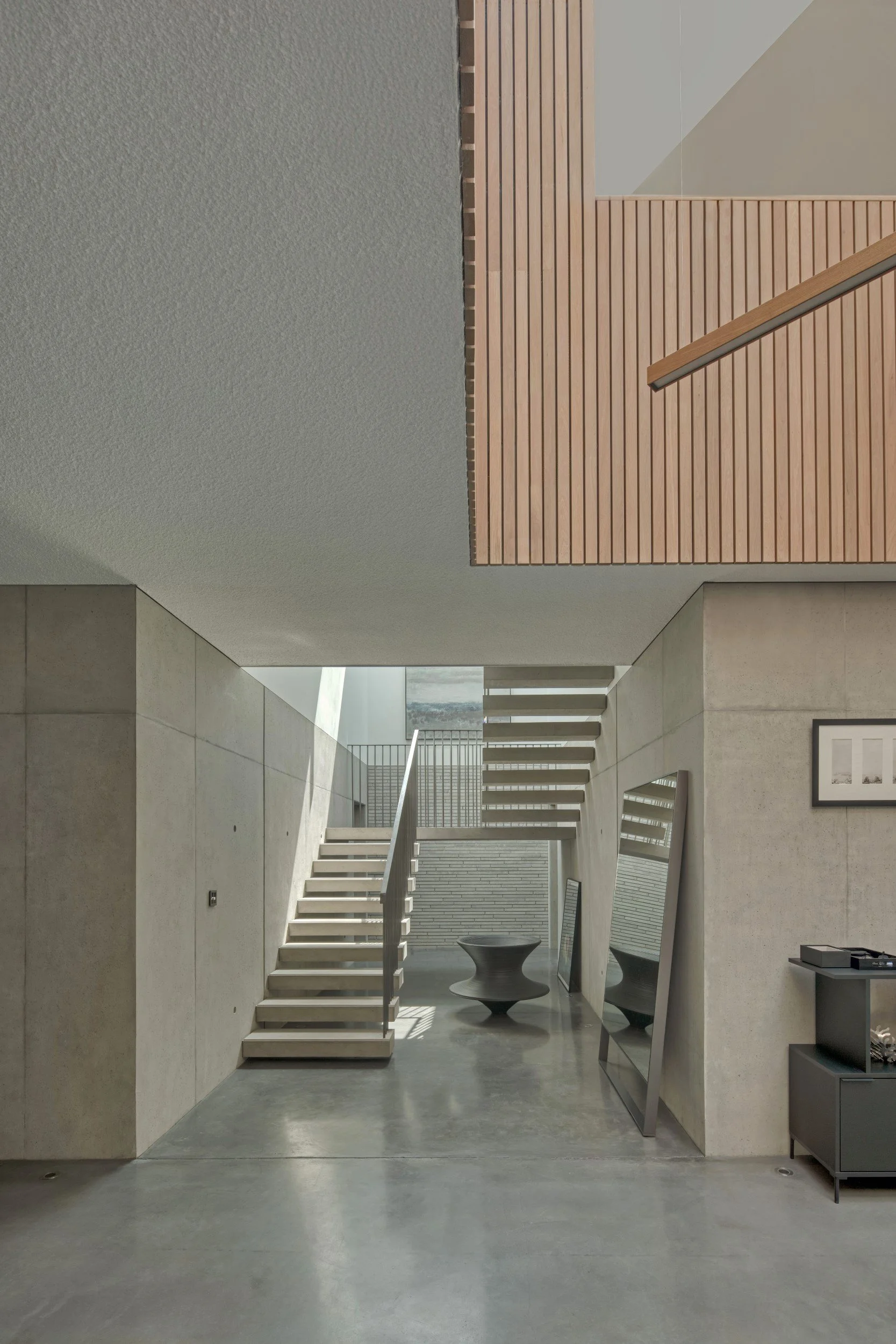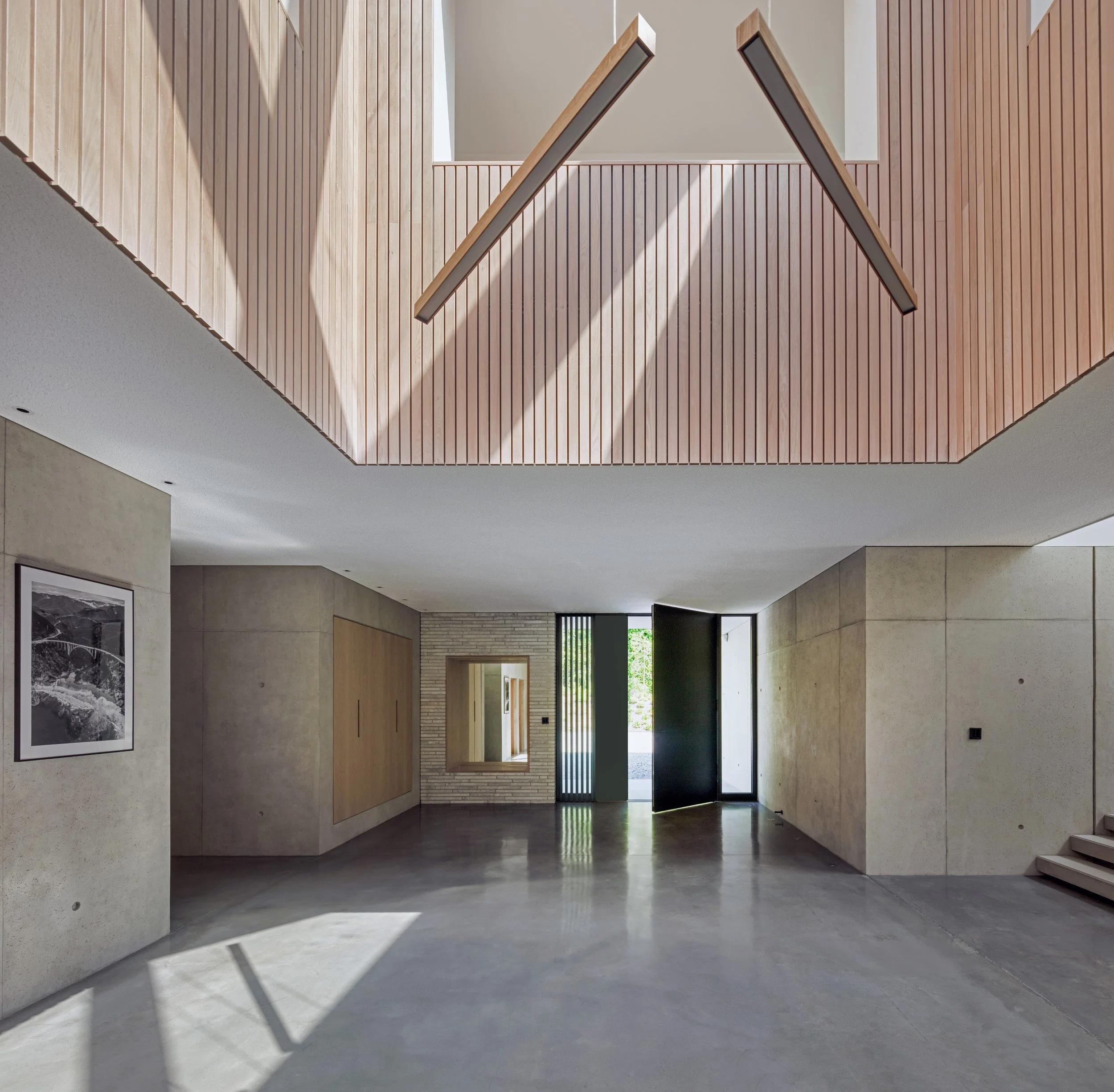 The forest is echoed in the materials in the central void. Light strikes the timber clad first floor, casting dynamic shadows and warm tones onto the dark polished concrete floors below. Concrete walls in this lower atrium space provide solidity and concrete stairs lead up the stairwell, lit by a secondary smaller rooflight that illuminates a feature painting.