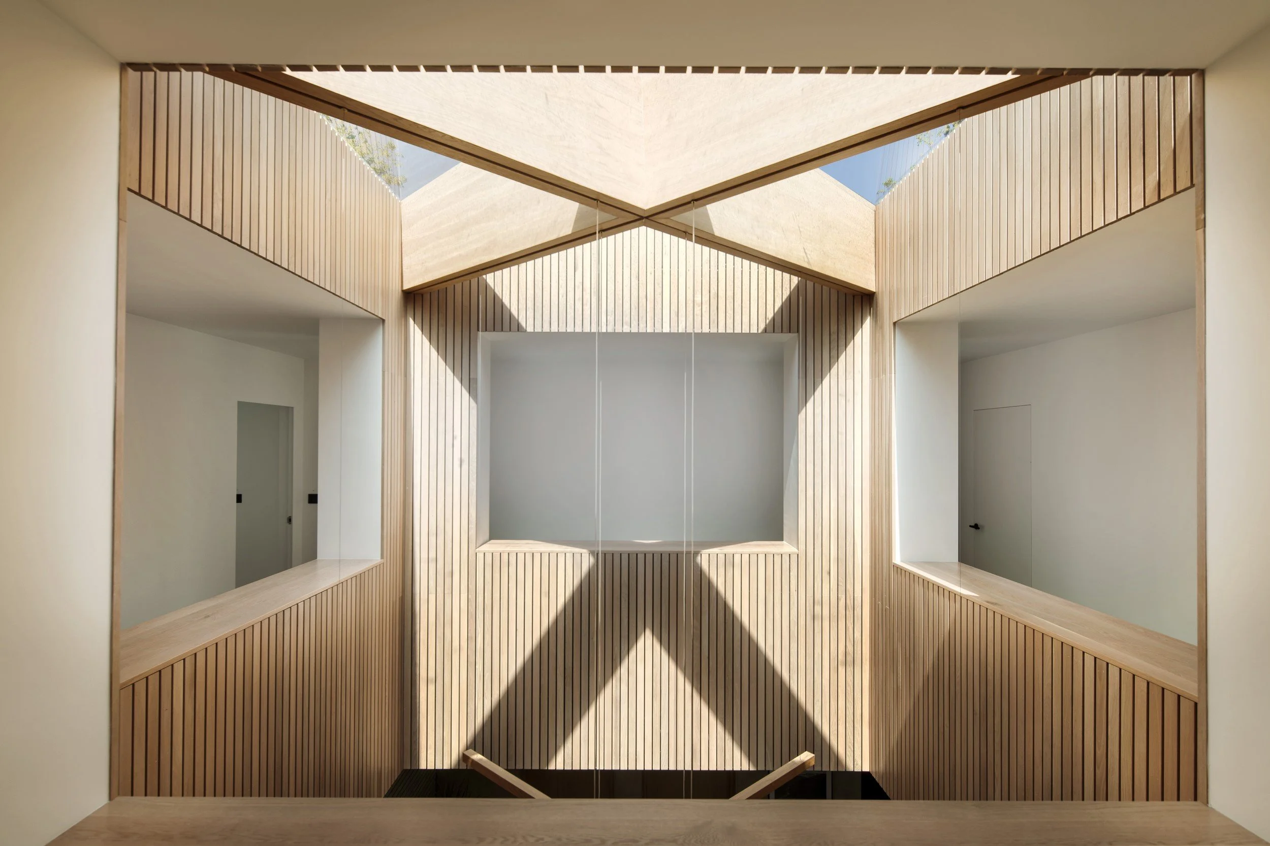 Light plays a pivotal role in delineating spaces and creating a dynamic atmosphere throughout the home, something our clients were eager to emphasise. Upon entering the home, you are greeted by a double height void with exposed timber structure supporting a large roof light. The glade itself is echoed in the heart of the home, creating a striking atmospheric experience as the light passes through the structure above and pools on the ground below.