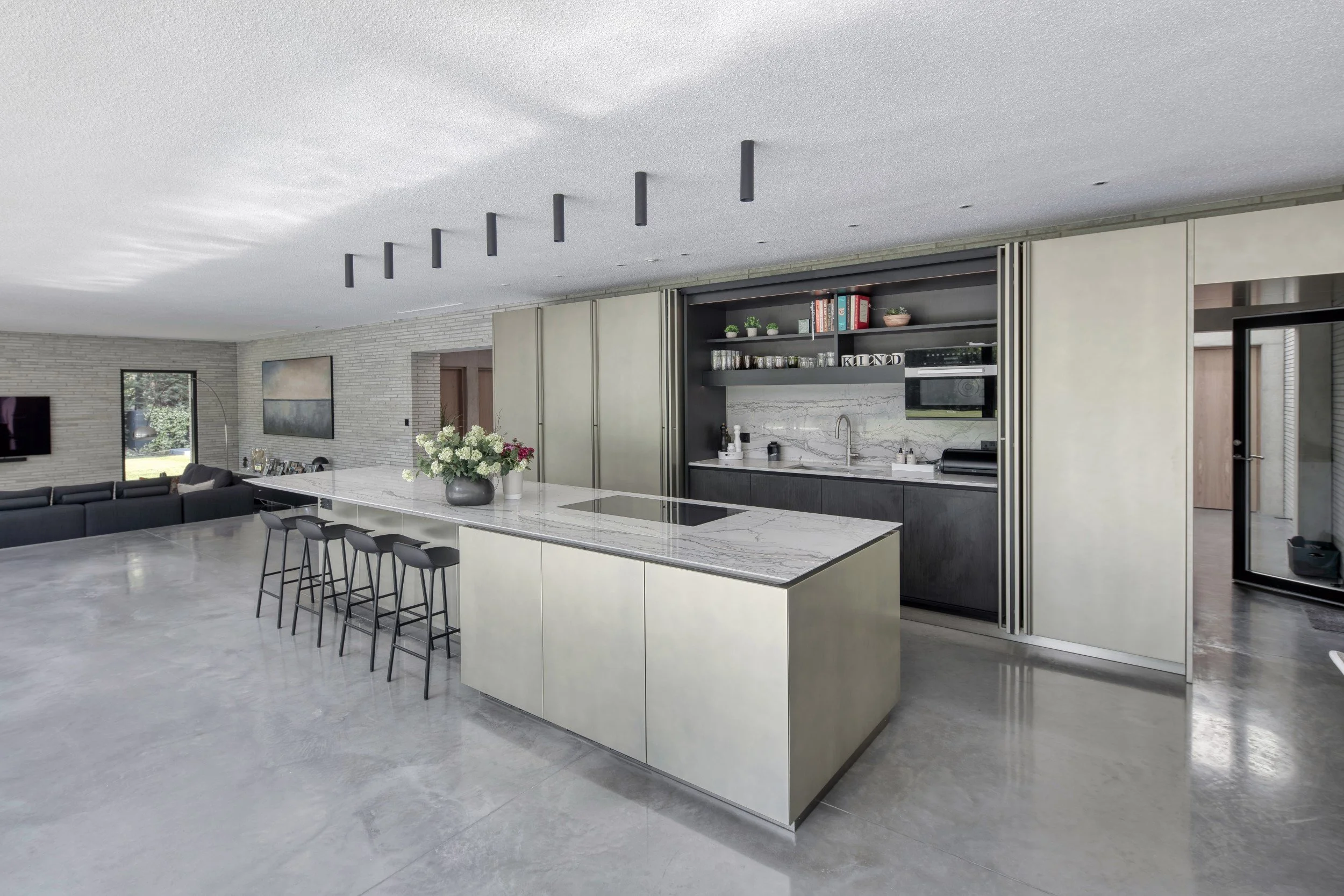 To the south, the house opens up into a spacious open plan kitchen, living, and dining area that extends onto the rear garden, complete with a patio, planters, sunken seating with a fire pit, and dining space. The west wing features a large private office with views of a semi-private courtyard, ideal for focused work or at-home meetings.